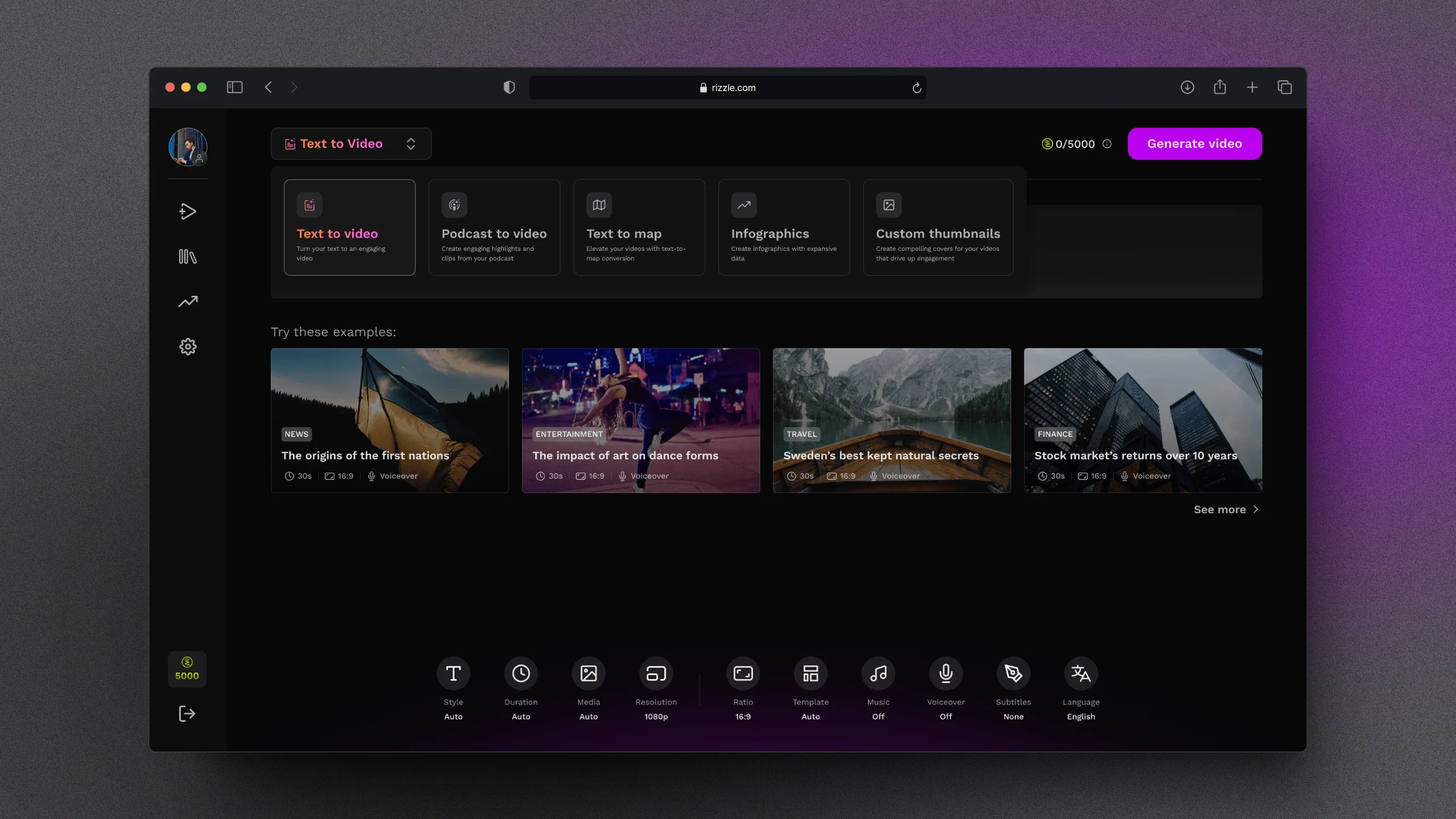 Whether you're creating videos, infographics, or thumbnails, Rizzle combines AI-powered templates, premium stock media, and top of the line music and voiceovers to help users craft the highest-quality content possible.